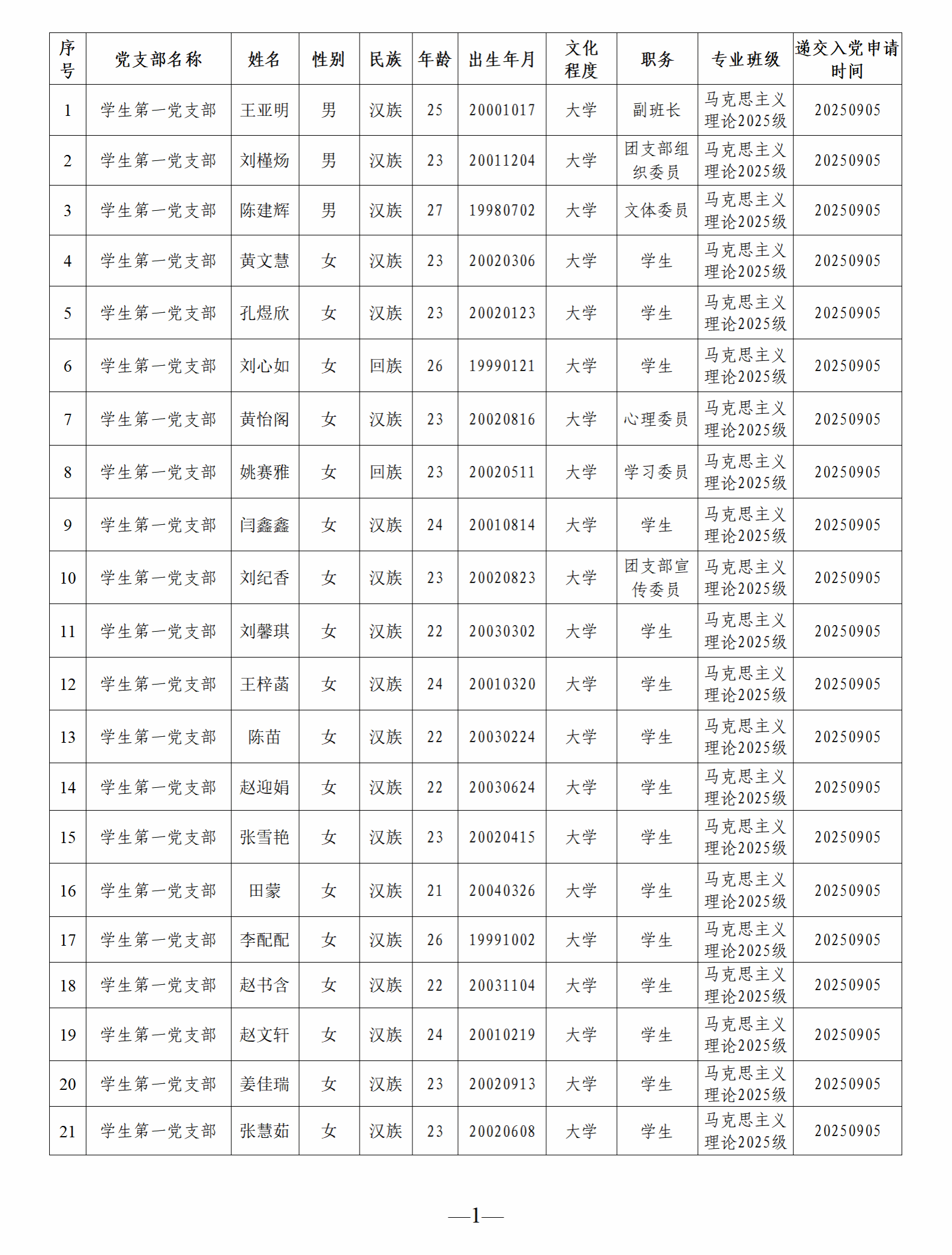 近期,黄文慧等21名同学向党组织递交入党申请书。根据发展党员工作有关要求,现将黄文慧等入党申请人的基本情况进行公示。