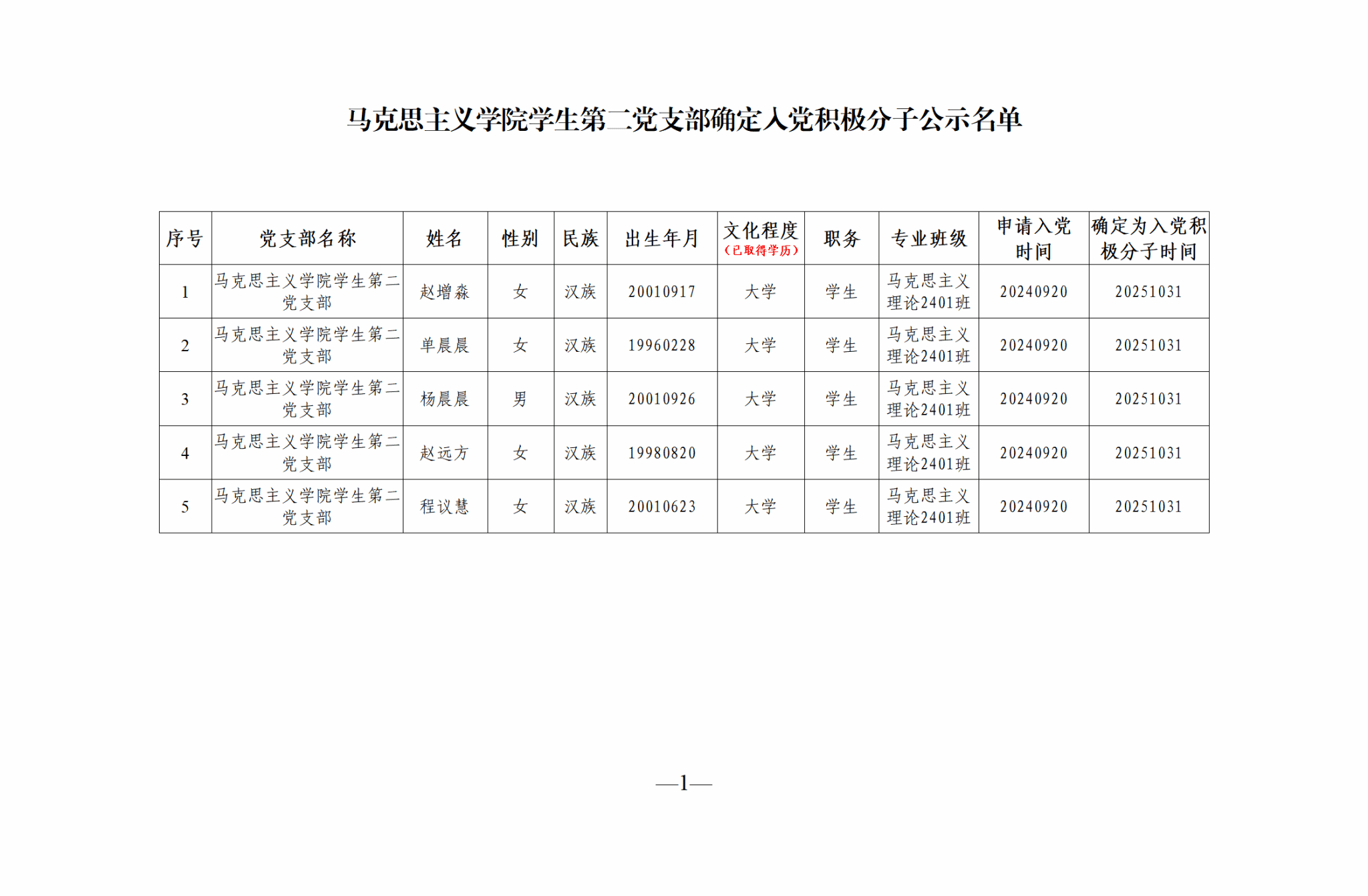 学生第二党支部召开支部委员会会议(或支部党员大会),经讨论研究同意确定赵增淼等5名同志为入党积极分子。根据发展党员工作要求,现将赵增淼等5名同志的情况予以公示,接受广大党员群众监督,公示期限为2025 年10月31日至11月6日)。如有异议,可在公示期内向党支部或党委(党总支)反映。