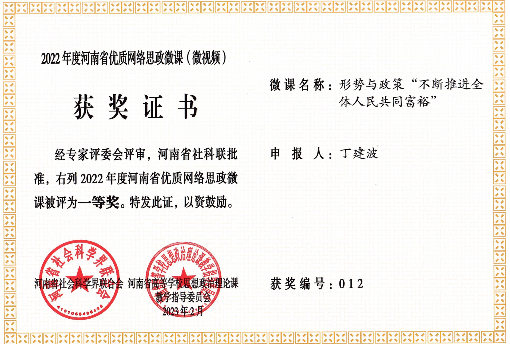 丁建波老师作品《形势与政策“不断推进全体人民共同富裕”》荣获思政微课一等奖。