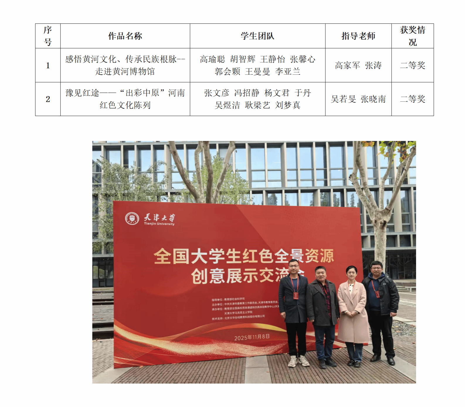 教师指导的2个作品脱颖而出,均荣获大赛二等奖。11月8日,全国大学生红色全景资源创意展示交流会和颁奖典礼在天津大学举办,草莓视频