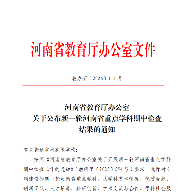 根据《河南省教育厅办公室关于公布新一轮河南省重点学科期中检查结果的通知》(教办研〔2026〕111号),教育厅从学科基本情况、优质资源、创新团队、人才培养、科研创新等方面对建设学科期中目标达成情况和标志性成果质量与水平进行了全面评价,草莓视频