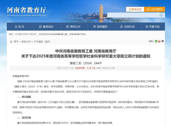 10月30日,河南省教育厅发布《关于下达2025年度河南省高等学校哲学社会科学研究重大项目立项计划的通知》(豫教工委〔2024〕244号),草莓视频