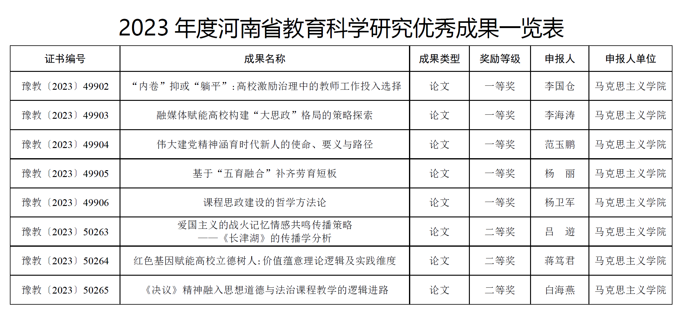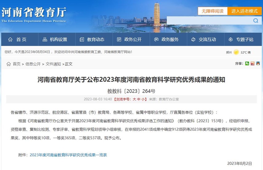 8月3日,河南省教育厅发布《关于公布2023年度河南省教育科学研究优秀成果的通知》(教教科〔2023〕264号)。经组织申报、资格审查、复制比检测、专家评审、省教育科学规划领导小组审核,在申报的2041项成果中确定912项获得2023年度河南省教育科学研究优秀成果奖。草莓视频