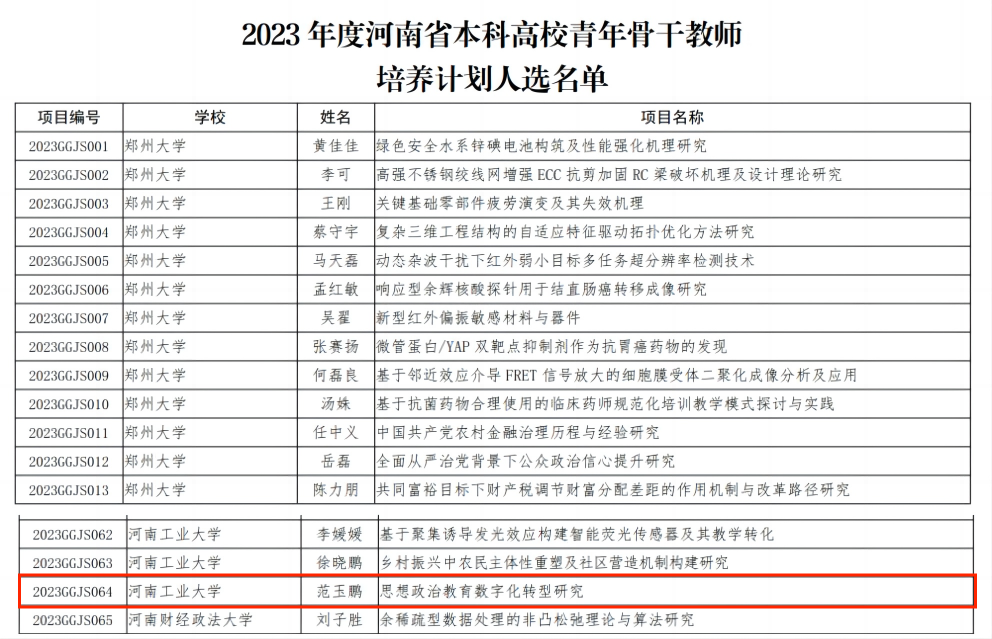 范玉鹏博士成功入选2023年度河南省高等学校青年骨干教师培养计划。