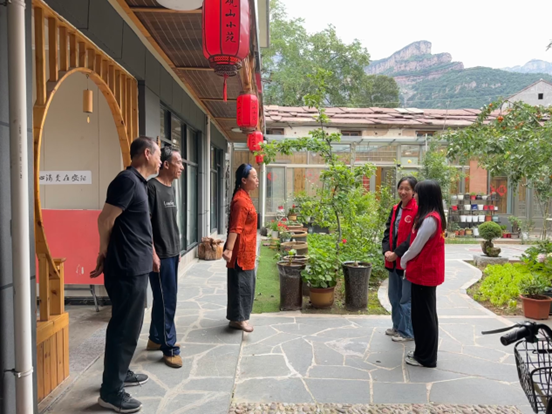 通过对红旗渠历史的了解和实地参观,团队成员来到红旗渠河畔的庙荒村。在2011年,庙荒村被确立为省级贫困村,近年来,庙荒村坚持以党建凝聚干部群众合力,以红旗渠精神激发贫困群众内生动力,凝心聚力、苦干实干,成为红旗渠畔文旅新村、最美乡村。团队成员采访了当地第一家开办民宿的共产党员。通过对老人的问答,团队成员了解到了庙荒村以红旗渠精神赋能文旅产业的实践过程,亲身体悟了红旗渠精神浸润和国家乡村振兴战略影响下的美丽乡村建设。如今,庙荒村街道干净,房屋错落有致,红旗渠水穿村而过,景色美不胜收。