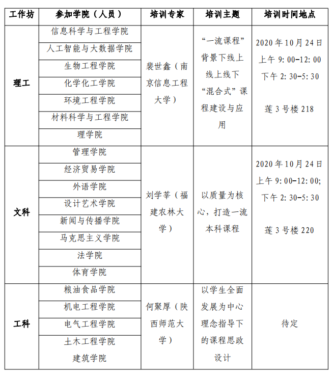 (三)学院需在 10 月 21 日中午 12 点之前将参加工作坊教师名单(附件 1)发至 [email protected],建议学院将教师教学能力提升培训与课程思政建设、校长教学质量奖、课程思政教学设计大赛、一流本科专业建设、一流本科课程建设等工作统筹考虑。